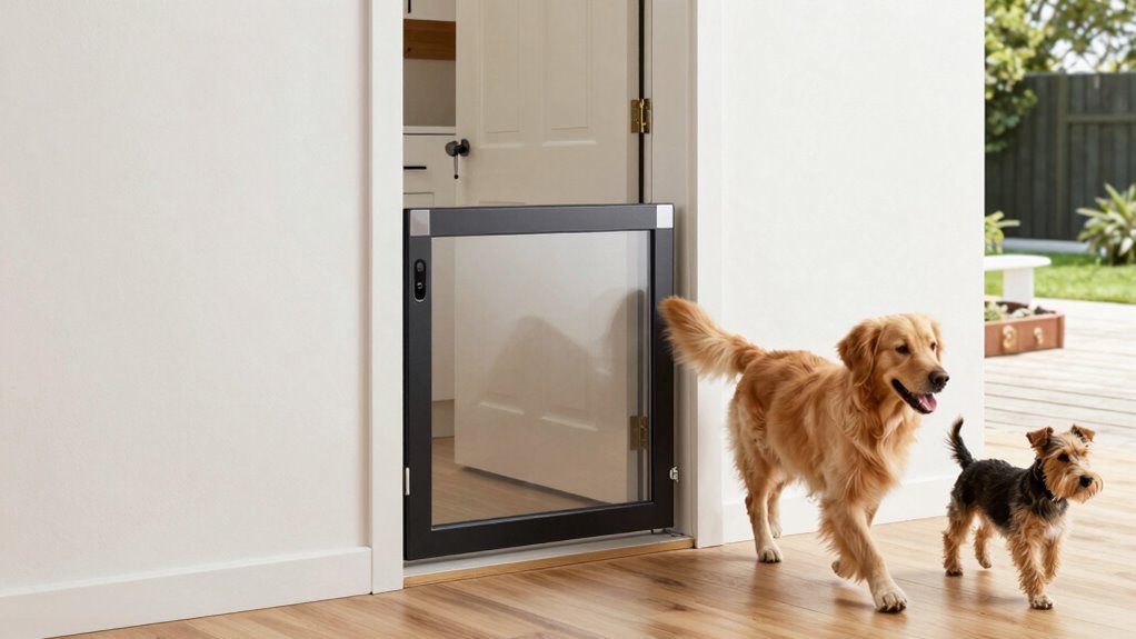 Ever wonder how to keep your high-traffic home secure while still giving your dog easy access? Modern automatic dog doors come with impressive security features that help prevent unauthorized entry. Steel deadbolt locks and intruder-proof panels make it tough for intruders or stray animals to force their way inside. Anti-pinch sensors and obstacle detection systems guarantee safety, stopping the door if a pet or object is in the way. Four-way access controls let you customize security levels—lock, exit only, entry only, or full access—tailoring safety to your household needs. Heavy-duty construction and secure sealing prevent break-ins. Plus, remote locking and real-time activity notifications give you peace of mind by allowing you to monitor and control access from anywhere.