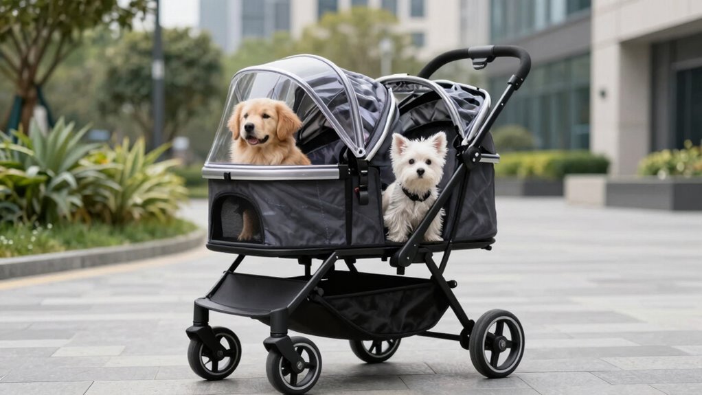 The materials in high-end double pet strollers are as tough as steel, built to last through countless adventures. I’ve found that quality fabrics and sturdy frames withstand wear and tear, even on rough terrains. These strollers are designed to keep your pets safe and comfortable, no matter how often you hit the road. Investing in durable materials guarantees your stroller remains a reliable companion for many journeys to come.