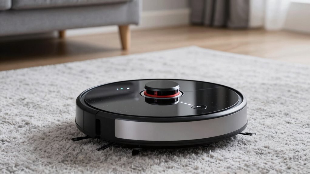 A robot vacuum’s ability to navigate effectively is just as important as its filtration system, especially in homes with pets. Advanced navigation systems like LiDAR or gyroscopes help the vacuum create accurate maps of your home, guaranteeing efficient cleaning routes. Sensors such as infrared, cliff, and object detection prevent collisions, falls, and getting stuck on furniture or stairs. Obstacle avoidance technology allows the vacuum to maneuver around cords, furniture, and even pets without human help. Precise mapping combined with real-time obstacle detection ensures thorough cleaning while protecting fragile objects and your furry friends. Additionally, self-learning algorithms adapt to changes in your home layout and obstacle positions over time, continuously optimizing cleaning paths for better performance and fewer mishaps.