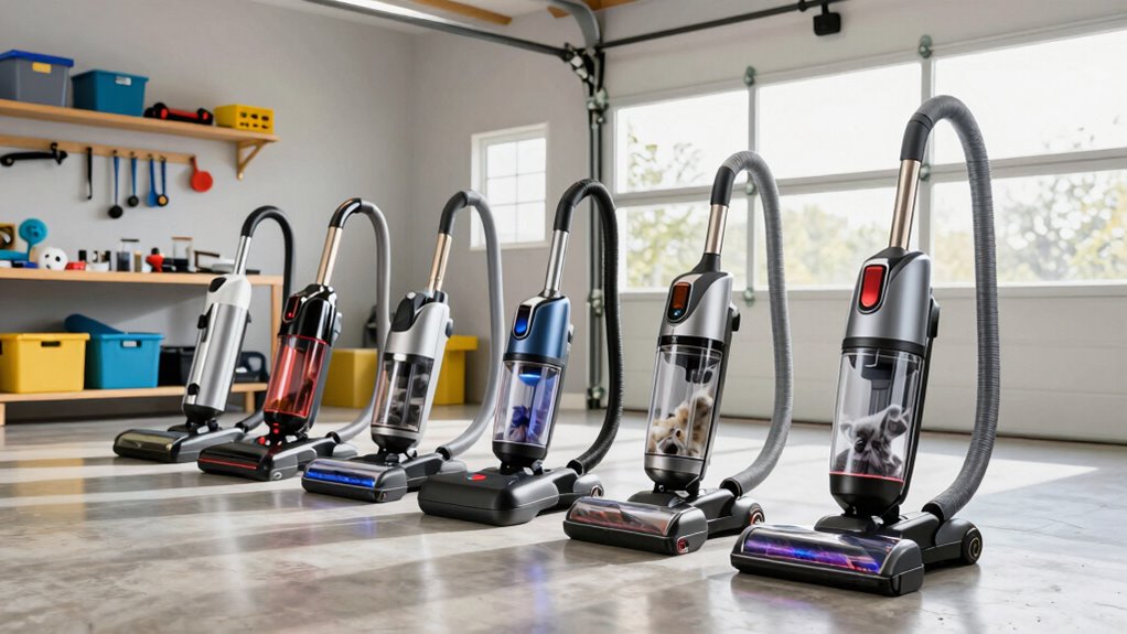 Having the right attachments can make all the difference when cleaning pet hair in your garage, as they enhance the vacuum’s versatility and effectiveness. Crevice tools and upholstery nozzles are essential for reaching tight spaces, furniture, and car interiors, guaranteeing no pet hair is missed. Swappable nozzles designed specifically for pet hair removal improve suction and agitation on various surfaces, providing a thorough clean. Attachments with rubberized or textured surfaces help loosen stubborn pet hair from carpets, bedding, and upholstery. A set of multiple attachments allows targeted cleaning in areas like stairs, vents, and corners, saving time and effort. Just make sure the attachments fit your vacuum’s hose diameter to assure a secure fit and peak performance during every cleaning session.